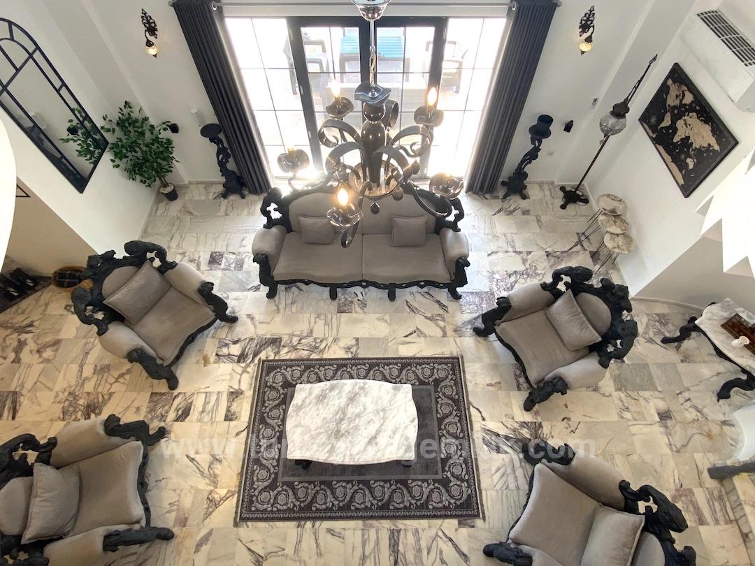The interiors of the main villa are just as impressive as the exteriors. The spacious and airy living room on the ground floor is striking with its high ceilings and impressive volume. The modern kitchen, located next to the living room, and the adjacent dining room offer an ideal flow for both daily life and gatherings. The unique and opulent sofa sets complement the grandeur of the living room, adding timeless elegance to the space. On the ground floor, there is also a double bedroom with an en-suite bathroom and independent entrance, a spacious hallway, and a guest WC.