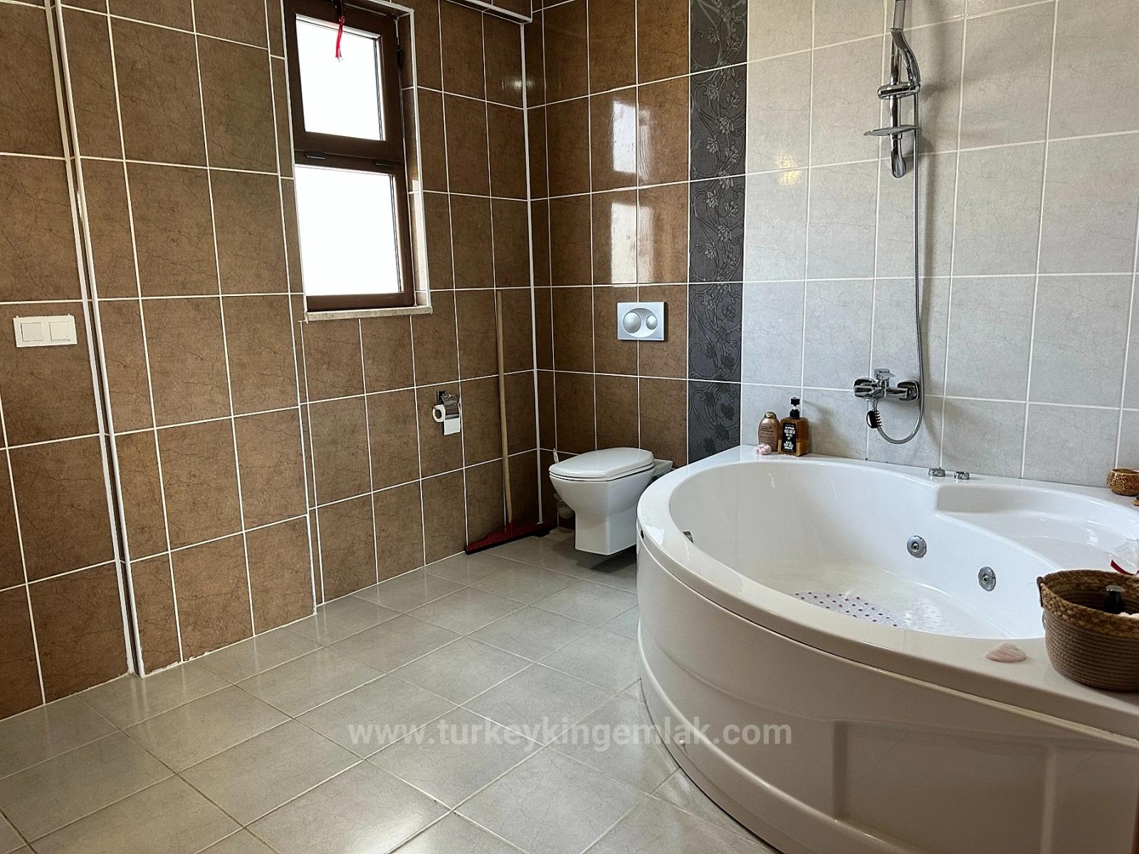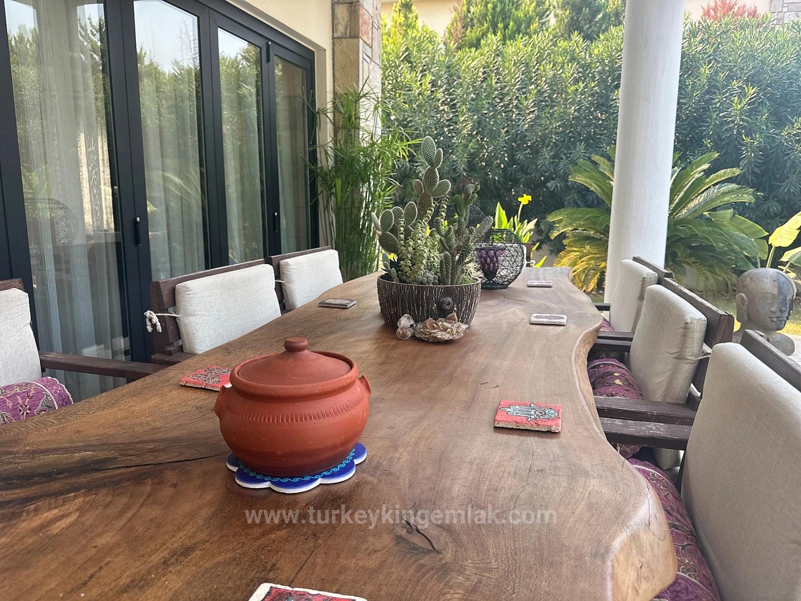 Outdoor living is practically perfected here. A large, shaded terrace on the ground floor opens onto the garden; a solid wooden dining table at its center is an inviting centerpiece for large gatherings and celebrations on long summer evenings. A little further on, a traditional Turkish pavilion sits amidst the greenery; its cushioned seating offers a cool, peaceful corner for reading, daydreaming, or relaxing on hot days.