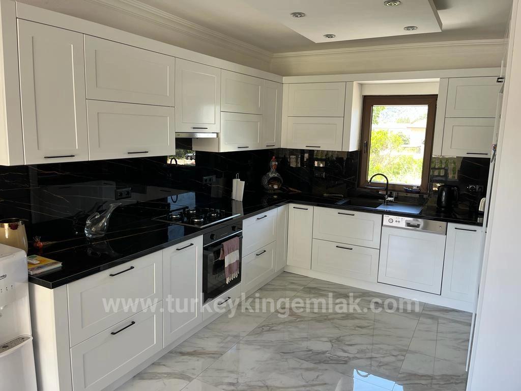 Thus, the view is brought to the heart of the house in its most impressive form. The open-plan living room invites the full splendor of the mountains uninterruptedly inside thanks to the large sliding glass doors that span the entire rear facade of the villa. The extremely spacious and extended balcony, reached by stepping out from these glass doors, is one of the most impressive areas of the house. This villa speaks to its view; and the balcony is designed for you to fully enjoy this view. With comfortable armchairs seating ten people and a large dining table, this is the indispensable place for both sunny days and long evening conversations. An electronic, foldable retractable roof system has been considered for the balcony, which is a real sun trap; thus, comfort is guaranteed in every season. The spacious kitchen, located right next to the living room, has recently been completely renovated and offers an extremely stylish and timeless design with its elegant white cabinets, black porcelain countertops and matching back panels. With its soft lines and classic appearance, it is both aesthetic and functional. The kitchen, with ample cabinet space, is fully equipped with all white goods. The separate dining area inside, with its wooden table seating six, creates an ideal setting for family meals and entertaining guests. The living room also includes a convenient bathroom for guests. Designed with a traditional planning approach, the bedrooms are located on the ground floor to maintain coolness during the summer months. All four bedrooms have spacious en-suite bathrooms designed in a modern wet-floor concept, fully tiled. The elegant marble coverings in cool tones used in each bathroom create an aesthetic unity that extends throughout the villa. The same marble has been re-laid on all floors of the house, giving the spaces a sophisticated and luxurious feel. The villa's exterior is just as impressive as its interior. The spacious garden is covered with well-maintained, lush green lawns; the traditional wooden gazebo at the far end of the garden is a hidden sanctuary for relaxing and enjoying the view. Closer to the house is a 45 m² swimming pool with a separate jacuzzi and a large sun terrace surrounding it. The outdoor dining area, covered with an electrically retractable roof, features a stone barbecue, a sink with under-cabinet, and an outdoor shower, making outdoor living a pleasure year-round. The villa's side features double storage areas and a separate outdoor toilet, while the front has a secure, gated parking area. All outdoor areas are equipped with colourful exterior lighting that highlights the trees, shrubs and walkways, creating a captivating atmosphere in the evening. Villa Cappuccino offers comfortable living year-round thanks to its central heating system and air conditioning units in every room. Recently installed and protected by a CCTV security system, the property has managed to maintain its unique character and warm spirit while preserving a luxurious and contemporary feel thanks to modernization and expansion work. Offered fully furnished, this exclusive villa is an ideal choice as both a year-round family home and a privileged holiday residence with its modern amenities, elegant details and impeccable living spaces. Villa Cappuccino is one of those rare places where view, comfort and elegance come together.
