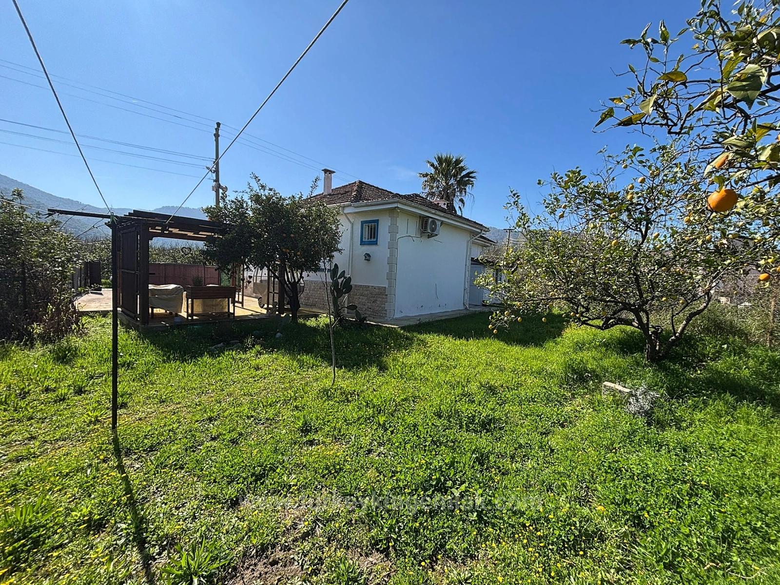 Nestled in the tranquil village of Okçular in Ortaca, Muğla, this charming single-storey bungalow offers a serene lifestyle embraced by nature. Set within a private, fully fenced 459 m² garden, the property invites peaceful outdoor living, with an underground irrigation system, a practical storage area, and a variety of mature fruit trees. A stylish gazebo provides a delightful shaded retreat for long summer afternoons, while an open parking space adds everyday convenience. The location balances seclusion with accessibility — just a 10-minute drive from Dalyan’s vibrant centre, 30 minutes from Dalaman Airport, and an easy 5-minute stroll to the local market.