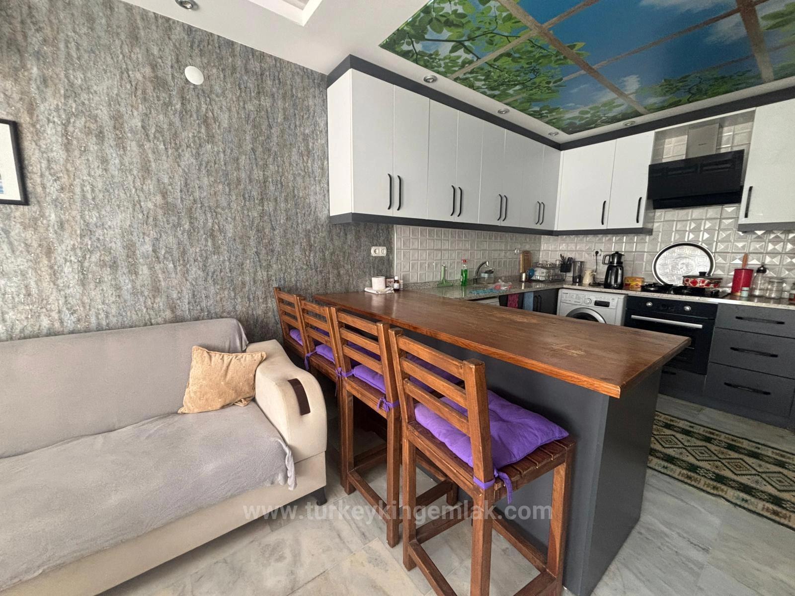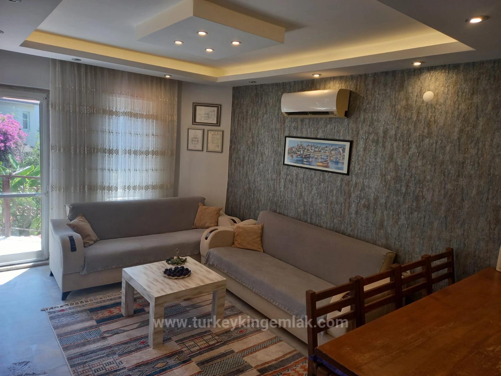 This furnished apartment with pool, located in the site in Ortaca Dalyan, Muğla; It stands out both by being within walking distance to the center and in a quiet location away from the city noise. Offering a comfortable living space with a spacious living room with an open kitchen, 2 comfortable bedrooms, a shared bathroom and a WC, the apartment also has a balcony where you can have a pleasant time. The presence of a solar energy system in the flat, which is offered for rent fully furnished, also provides a significant advantage. While its location very close to the markets and the marketplace makes daily life easier, it offers a comfortable and enjoyable life opportunity thanks to the pool and peaceful surroundings within the site.