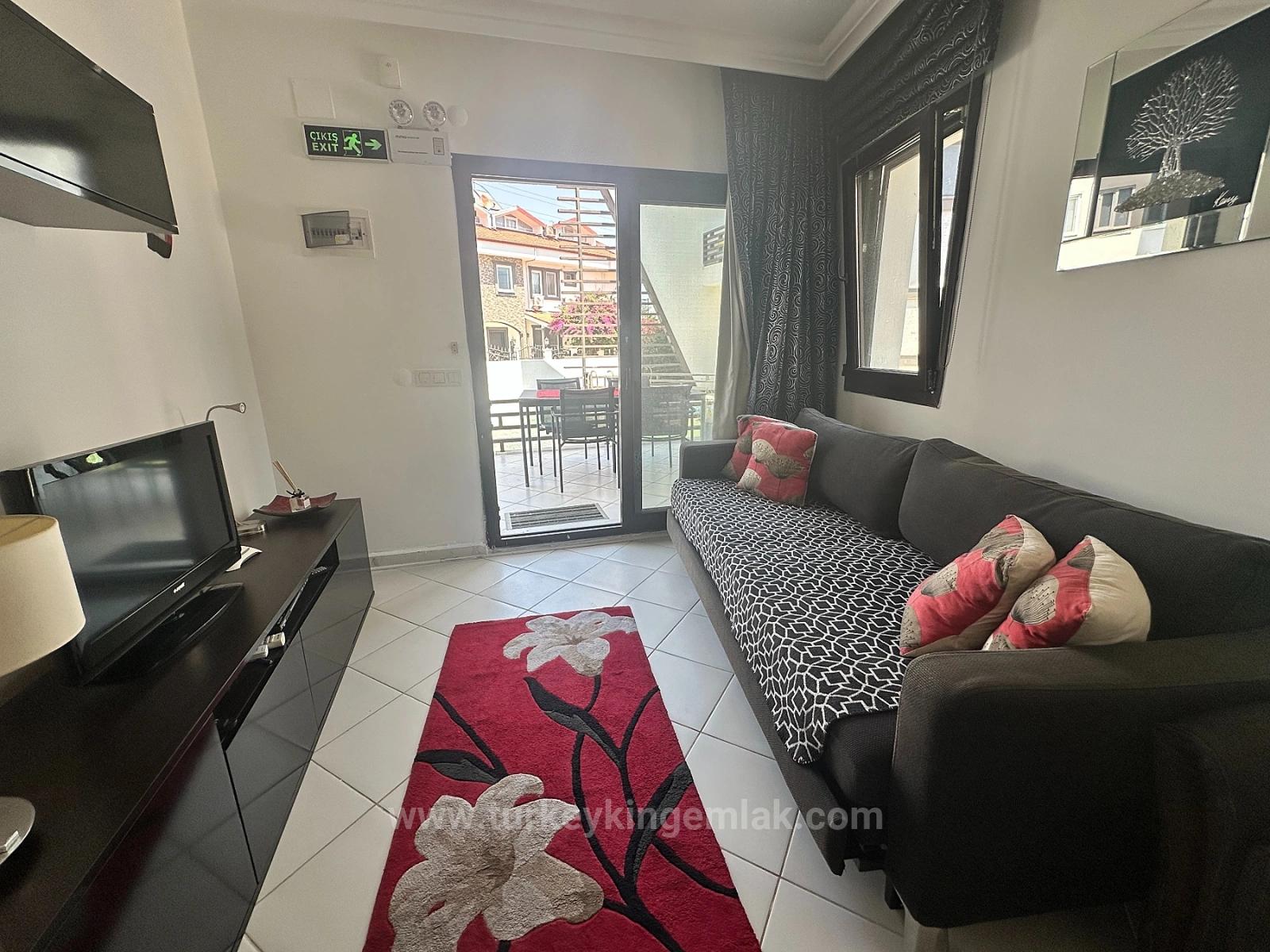 Расположенная в эксклюзивном и престижном комплексе всего из 10 апартаментов, эта выдающаяся недвижимость доступна по эстетичному деревянному мосту, и вы попадаете внутрь через собственный отдельный вход. Бассейн, являющийся центральным элементом комплекса, выделяется своими элегантными зонами отдыха в форме лилий, а просторная общая терраса для принятия солнечных ванн вокруг него предлагает приятные моменты в течение всего дня. Просторная и приватная терраса апартаментов выходит прямо к бассейну, создавая уникальное жилое пространство, где вы можете выпить утренний кофе в тишине воды или насладиться коктейлем на фоне заката вечером. При входе в квартиру сразу ощущается простор и современная элегантность. Большая спальня с двуспальной кроватью, залитая естественным светом, предлагает комфорт и роскошь благодаря встроенным шкафам и прямому выходу на террасу и к бассейну. Стильная ванная комната с душем, выполненная в современном стиле, отделана высококачественными материалами. Открытая планировка гостиной и кухни сочетает в себе эстетику и функциональность, а полностью оборудованная современная кухня создает идеальную обстановку для приятных трапез и встреч. Эта эксклюзивная квартира, предлагаемая к продаже полностью меблированной, готова к немедленному заселению без каких-либо дополнительных затрат. Если вы хотите незабываемый дом для отдыха или эксклюзивное жилое пространство в самом сердце Дальяна, где вы сможете наслаждаться жизнью круглый год, эта недвижимость представляет собой редкую возможность благодаря своему местоположению и качеству жизни, которое она предлагает.