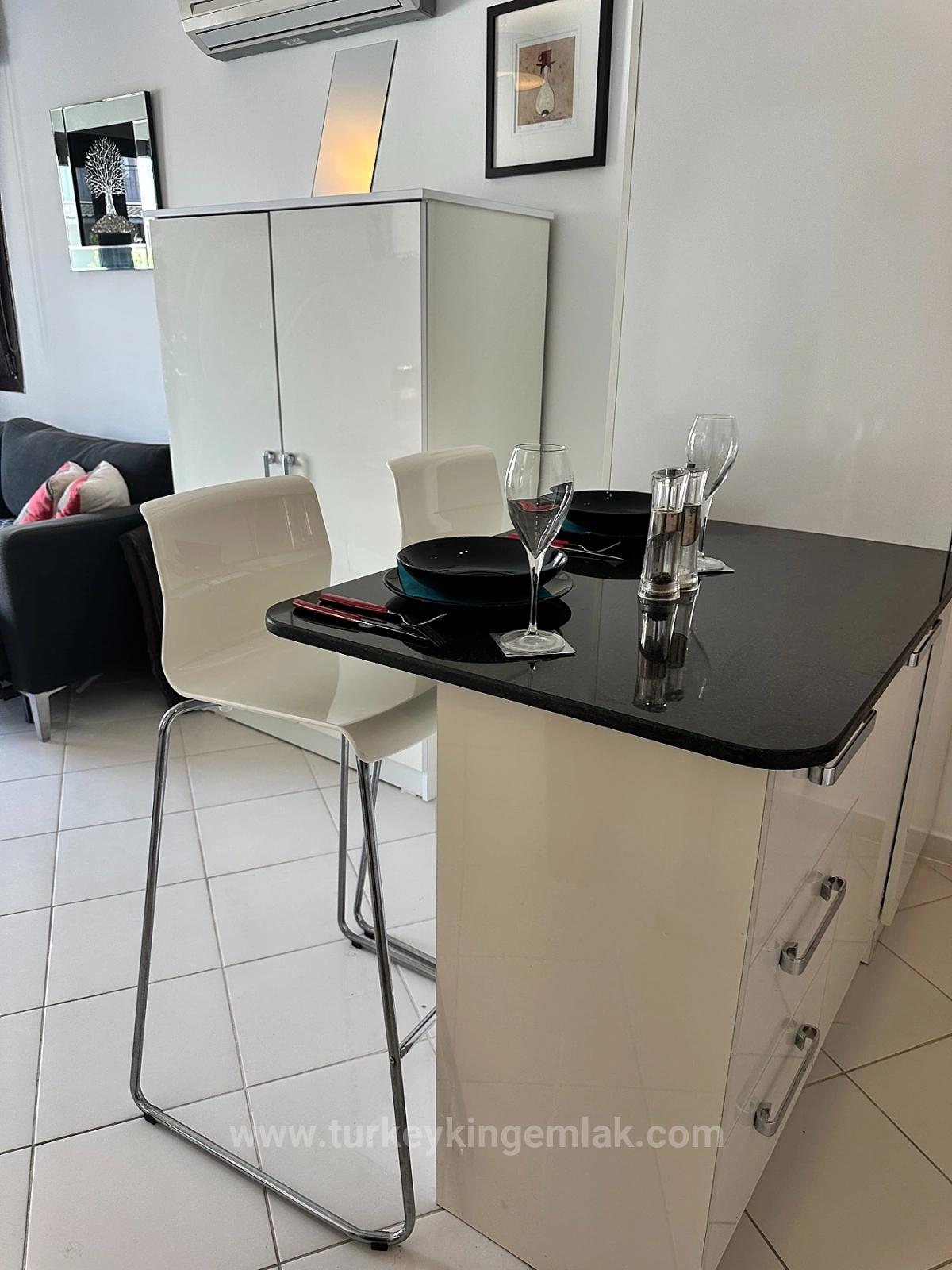 İç mekâna girildiğinde ferahlık ve modern şıklık hemen hissediliyor. Doğal ışık alan geniş çift kişilik yatak odası, gömme dolapları ve teras ile havuza doğrudan erişimiyle konforu ve lüksü bir arada sunuyor. Modern çizgilere sahip şık duşlu banyo, yüksek kaliteli malzemelerle tasarlanmış. Açık plan salon ve mutfak alanı ise hem estetik hem de fonksiyonel bir yaşam sunarken, tam donanımlı çağdaş mutfağıyla keyifli yemekler ve davetler için ideal bir ortam oluşturuyor.