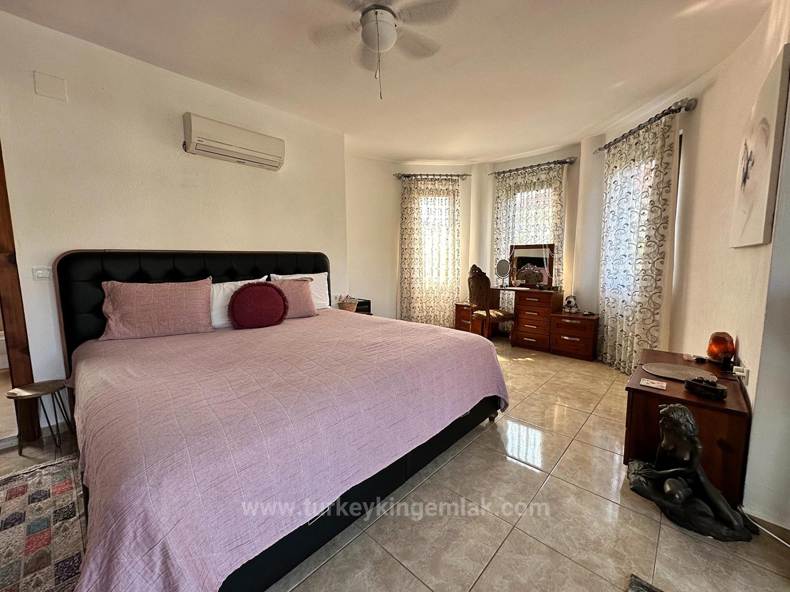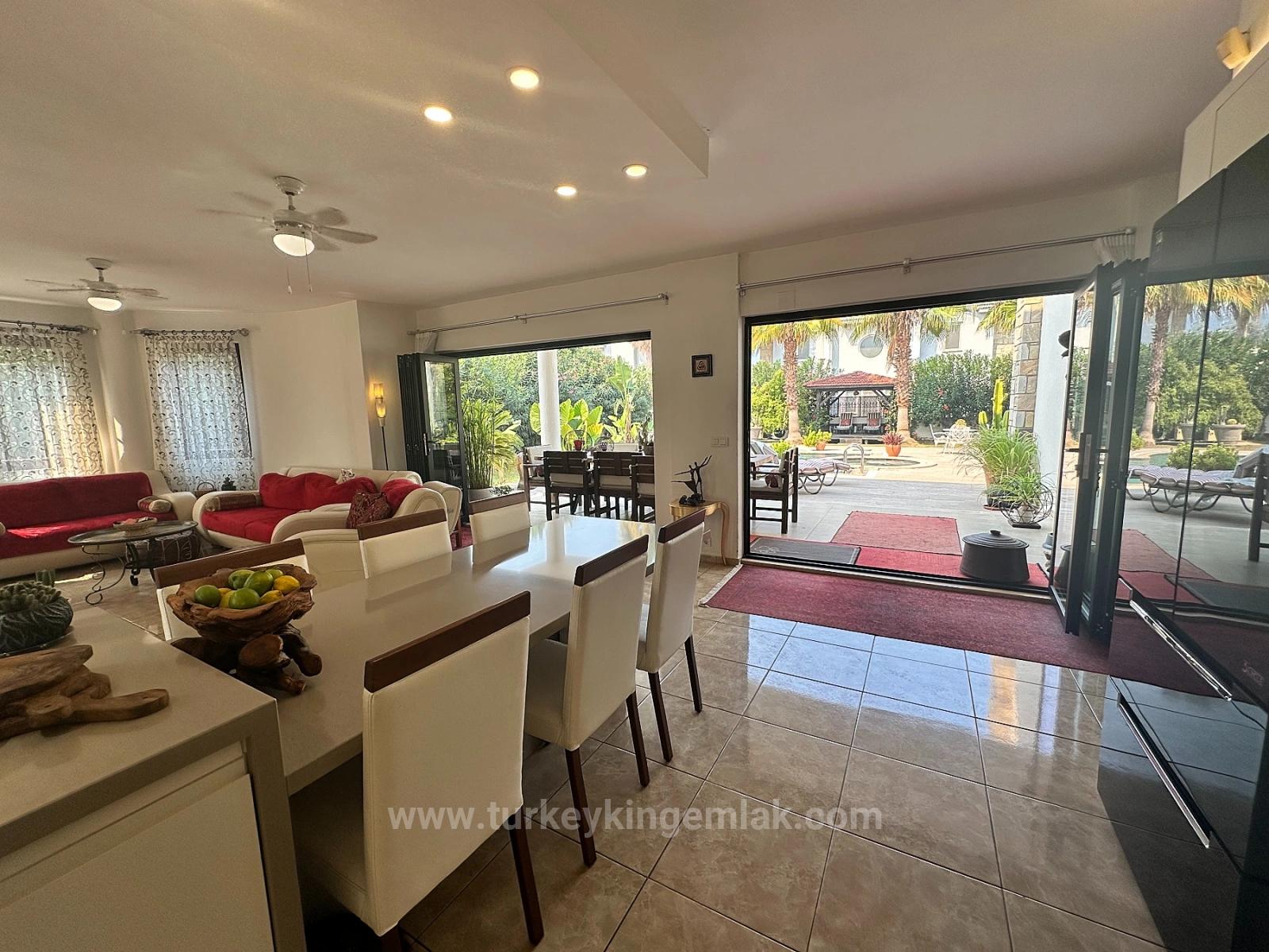 Kapılarından içeri adım attığınız anda villa, kendi başına ayrı bir dünya olarak karşınıza çıkar. Yüksek duvarlarla çevrili bahçe, adeta koruyucu bir koza gibi yükselir; rengârenk çiçeklerle, özenle şekillendirilmiş çalılıklarla ve olgunlaşmaya hazırlanan meyve ağaçlarla dolu bir cenneti içine alır. Yeni döşenmiş doğal taş yollar, mis kokulu çiçek sınırlarının arasından geçerek sizi villanın merkezine götürür: ısıtmalı, tuzlu suyla çalışan ve jakuzili muhteşem bir havuz. Burada yüzme adeta bir sanat hâline gelmiştir — suya doğru nazikçe dökülen şelale özelliği, havayı akarsu sesinin huzur verici melodisiyle doldurur; sığ güneşlenme alanı ise altın güneş altında yarı suya gömülü şekilde serinleyerek dinlenme imkânı tanır.