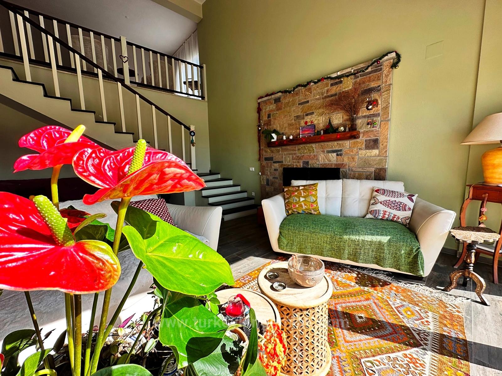 Yaklaşık 5.000 m² büyüklüğündeki arsa üzerinde yer alan mülkün bahçesi yıllar içinde büyük bir özenle işlenmiş, sevgiyle yetiştirilmiş ve adeta yaşayan bir peyzaja dönüştürülmüştür. Giriş kapılarından içeri adım attığınızda, dört araçlık üzeri kapalı otopark alanı ve sizi eve doğru yönlendiren doğal taştan bir yürüyüş yolu karşılar. Bahçenin her köşesi, sanata ve özgünlüğe değer veren sahiplerinin yaratıcılığını yansıtan sürpriz detaylarla doludur; her dönüşte farklı bir köşe, farklı bir atmosfer keşfedersiniz. Bahçe içerisinde duş alanı, sebze bahçesi ve 60 m² büyüklüğünde etkileyici bir yüzme havuzu yer alır. Evin arka cephesinde bulunan, yarısı kapalı yarısı güneşe açık geniş teras ise gün boyu dinlenmek, manzaranın tadını çıkarmak ve Akdeniz güneşini içinize çekmek için kusursuz bir ortam sunar.