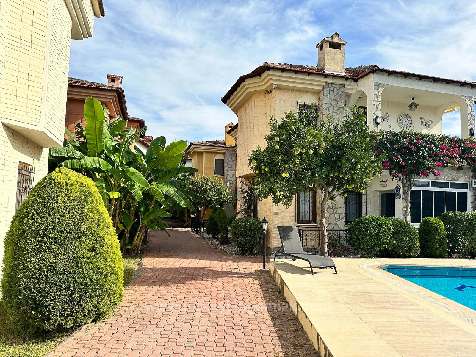 Toplam 7 adet villadan oluşan bu bakımlı sitede 1 adet villla satılıktır,Kat mülkiyet sistemi kuruludur ,kompleksin ön cephesinde, 40 m² büyüklüğünde ortak bir yüzme havuzu bulunur. Havuz alanı, tropikal bitkilerle bezenmiş bahçelerle çevrilidir ve her villaya ferah, yeşil ve davetkâr bir atmosfer kazandırır. Kompakt ama özenle planlanmış site yapısı, hem komşuluk hissini hem de mahremiyeti dengeli bir şekilde sunar.