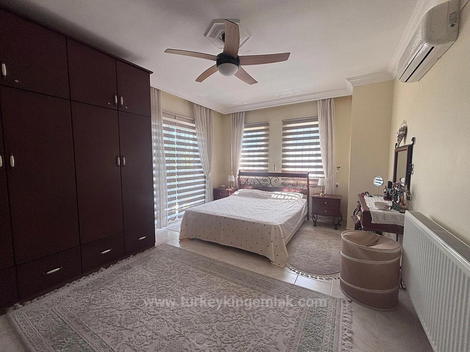 Dış alanlar ise bu mülkün gerçek parlayan yönüdür. Merkezinde yer alan 66 m²’lik yüzme havuzu, geniş güneşlenme terasıyla çevrili olup .Akdeniz güneşinin keyfini çıkarmak için mükemmel bir ortam sunar. Geleneksel Türk köşkü, uzun öğle yemekleri veya kitapla geçirilen huzurlu saatler için gölgeli bir alan sağlar. Depolama alanı ve özel garajla tamamlanan düzenli peyzajlı bahçe hem işlevsel hem de estetiktir.